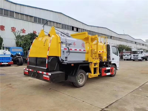 ① 將后門操作手柄推至開啟位置,箱體左右兩側墻板油缸伸出,使箱體后門先水平推出一段距離后,向上翻起打開;松開操作手柄回中位;