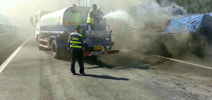 事情是這樣的,南昌的劉老板正在江西某告訴路上進行樹木養(yǎng)護灌溉,(大家肯會問南昌的劉老板咋跑江西告訴上養(yǎng)護樹木了,那是應為南昌的劉老板進行招標,贏得了江西某告訴路段的養(yǎng)護)今天剛好在告訴路上進行樹木養(yǎng)護,看見前方路段冒起了濃煙滾滾的,根據劉老板多年的經驗,一看就知道前方發(fā)生了火災,這位劉老板不管是森林火災還是車輛火災,都要前去滅火,(大家都知道火在不管的情況下,才能變成火災,只要把火在剛開始燃燒的時候給滅掉就不會發(fā)生火災)這劉老板一過去就看見一輛半掛車在燃燒,這是的火還不是非常大,還是非常危險的,這劉老板不更具自己多年的經驗判定火勢自己的灑水車能把火給滅了,上去就加大馬力,利用灑水車水炮進行滅火,經過半小時火勢給控制住了,只剩濃煙,劉老板這不能松懈一定要等消防隊來啦交給消防隊才能放心,就在旁邊進行霧狀噴水,(大家都知道灑水車水炮是有兩種用途的,一種是水柱狀,這書水炮在水柱狀時是能消防滅火的,射程能達到35米,大家也要注意沖擊力大有危險,不要對準人只用。二是霧狀,灑水車水炮霧狀時能降低空氣里面的粉塵,是分解濃霧的最得力的幫手。)