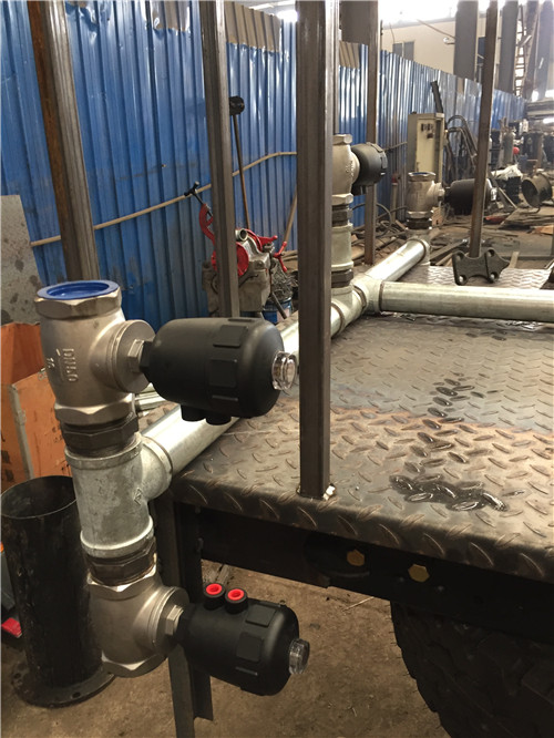 (2)灑水車的管網(wǎng)系統(tǒng),一般是由一個四位三通球閥、一個單項球閥和一個消防閥門組合而成,不清楚可以看上圖的管網(wǎng)結(jié)構(gòu)示意圖。灑水車抽水的時四位三通球閥的正確開關(guān)位置,應(yīng)該將灑水車專用手柄對到車前(就是該球閥上有一個記號)這個記號對車前,然后再將單項球閥手柄與管網(wǎng)平齊,消防閥門關(guān)閉,操作好以后。然后啟動灑水車發(fā)動機,讓水泵工作起來,水就會抽入水罐里面了。