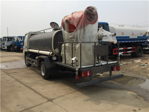 專用部分:具有前沖后灑、側(cè)噴(更換噴頭后變?yōu)閭?cè)花灑)、后置式工作平臺(tái)(帶踏梯,四周有安全護(hù)欄)、平臺(tái)上設(shè)置有高壓水炮(可360°旋轉(zhuǎn),可調(diào)成柱狀最大射程28米,也可調(diào)成霧狀最大射程14米,可調(diào)成:直沖狀、大雨、中雨、小雨、毛毛雨),整車灑水寬度大于14米.配備優(yōu)質(zhì)大功率專用灑水泵,取力器,雜物過(guò)濾網(wǎng),國(guó)標(biāo)通用65型消防接口(可通過(guò)消防栓加水)、1套自流球閥系統(tǒng)(可自吸自排,最大吸程6米),2根引水鋼絲膠管(帶陰陽(yáng)快速接頭),配鎖,水位計(jì),作業(yè)高音喇叭.兩側(cè)及后加強(qiáng)型保險(xiǎn)杠,防滑爬梯,膠管儲(chǔ)存筒。