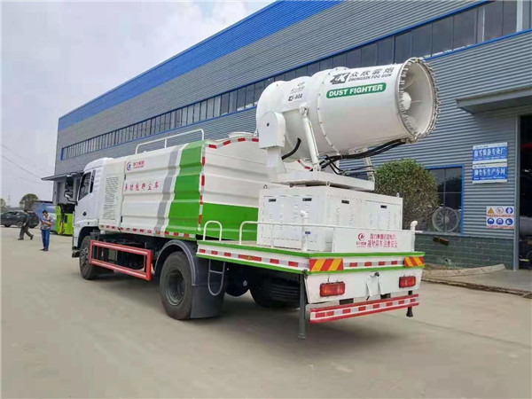 2、新款東風多功能帶霧炮的抑塵車標配前沖、后灑、側(cè)噴、后工作平臺、綠化炮、自流閥、消防接口、水位計各1個,輸水管3米2根,罐體右后上方帶花灑2個。