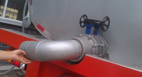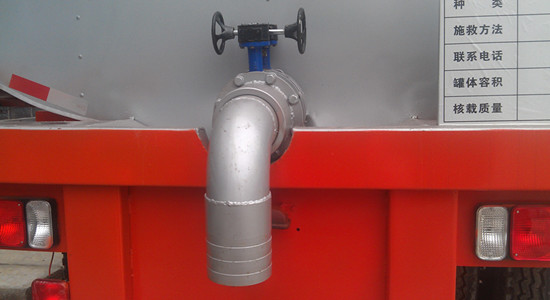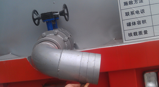 瀝青運(yùn)輸車也叫液態(tài)瀝青保溫運(yùn)輸車,由于液態(tài)瀝青介質(zhì)比較粘稠,而且有一定的溫度要求,所以排泄大多屬于自流。一般瀝青運(yùn)輸車自流裝置在車輛的尾部,采用耐高溫球閥控制。如下圖。