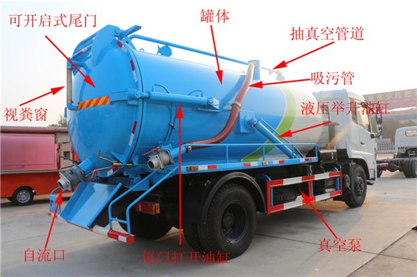 真空吸污車的專用部分是由取力器、傳動軸、真空吸污泵、壓力罐體、液壓部分,網管系統(tǒng)、真空壓力表、視污窗洗手裝置組成,隨車配置的有大功率真空吸污泵和優(yōu)質的液壓控制系統(tǒng),罐體封頭一次鑄成型、罐體可后開、雙頂自卸。罐內的污物可通過后蓋直接傾倒出來,具有真空度高、噸位大、效率高、用途更廣泛的特點。