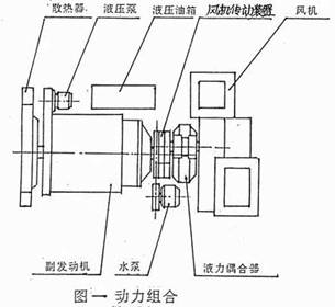 動力組合由散熱器、副發(fā)動機、液力偶合器、皮帶傳動裝置、風(fēng)機組成。為清掃作業(yè)提供動力源。動力組合通過副框架固定在底盤大梁上。