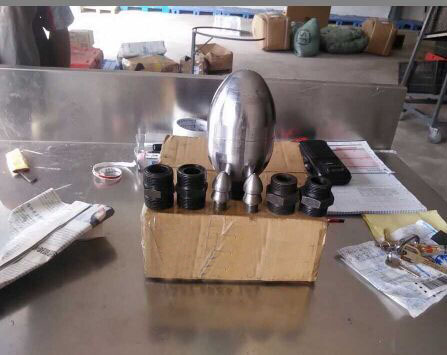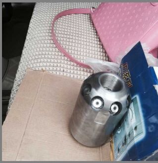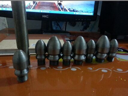 除了直噴頭以外,每個噴頭都有向后的6個噴射孔(一邊穿透、破碎、攪拌堵塞物,一邊推動噴頭和耐高壓水管前進),其中2、3、5、8號另外,還有一個前噴孔(穿刺堵塞物并作為導(dǎo)引孔)。