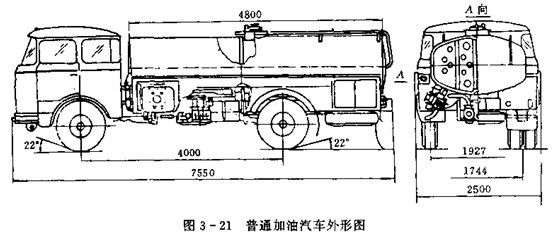 加油車(chē)通常由氣車(chē)底盤(pán)、罐體、油管、各種閥、各種工作儀表,過(guò)濾器、靜電消除裝置,軟管盤(pán)總成,加油槍及驅(qū)動(dòng)裝置等組成。圖3-21為普通加油汽車(chē)外形圖。