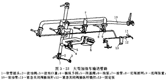 加油車(chē)為了具備給受油設(shè)備加油、自吸裝油、循環(huán)攪油,移動(dòng)泵站作用,吸回加油軟管中的油液等五種功能,輸油管路也較運(yùn)油汽車(chē)復(fù)雜,并設(shè)有油泵。圖3-23是一大型加油車(chē)的管路系統(tǒng)。該車(chē)有四個(gè)艙, 每個(gè)艙底都裝有一個(gè)底閥裝置(見(jiàn)圖3-24),并且為放油方便,在汽車(chē)左、右兩側(cè)及尾部各設(shè)置一個(gè)放油閥,以便適應(yīng)車(chē)輛在不同方位上時(shí)進(jìn)行加油作業(yè)。