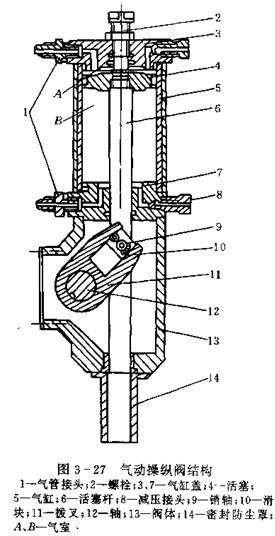 放油閥的操縱形式有手動(dòng),液動(dòng),氣動(dòng)和電動(dòng)等,根據(jù)總布置要求確定,手動(dòng)形式簡(jiǎn)單,在無(wú)特殊要求時(shí),一般采用手動(dòng),為提高機(jī)械化程度,也可采用液動(dòng)或氣動(dòng),液動(dòng)力源可取本車(chē)動(dòng)力轉(zhuǎn)向系統(tǒng)的壓力油液,氣壓源可取本車(chē)制去氣源。電動(dòng)形式容易引起火災(zāi)。圖3-27為氣動(dòng)操縱閥的結(jié)構(gòu),用來(lái)操縱放油閥或其它的控制閥,當(dāng)氣室A充氣,氣室B排氣時(shí),空氣壓力推動(dòng)活塞4通過(guò)活塞桿6滑塊10使拔叉11轉(zhuǎn)動(dòng),于是轉(zhuǎn)軸12使放油閥(控制閥)開(kāi)啟或關(guān)閉。