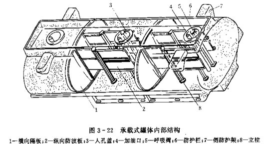 加油車(chē)的罐體與運(yùn)油車(chē)的罐體相似,也具有運(yùn)油車(chē)罐體的基本裝置。圖3-22為大型加油車(chē)罐體結(jié)構(gòu)示意圖。橫向隔板1將罐體分成三個(gè)艙,每個(gè)艙內(nèi)設(shè)有橫向防波板。罐體寬度較大時(shí),可再設(shè)縱向防波板。2防護(hù)欄6和側(cè)防護(hù)架7是用來(lái)保護(hù)加油口,呼吸閥等不受意外碰傷,以免造成燃油外溢。大型罐體還可采用立柱8以提高罐體剛度。