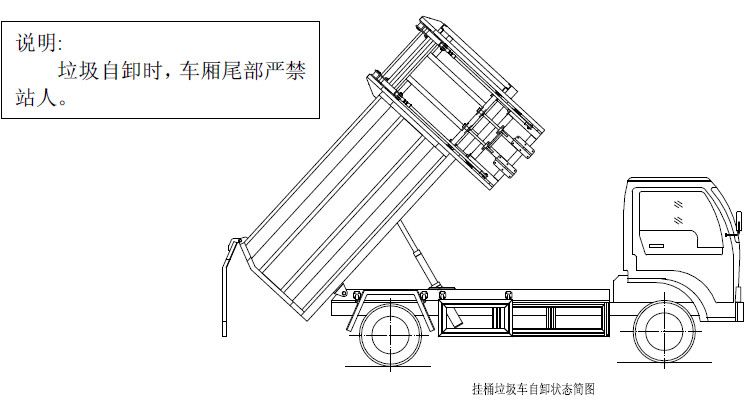整車運(yùn)轉(zhuǎn)達(dá)到6 個(gè)標(biāo)準(zhǔn)氣壓時(shí)掛上取力器,檢查各部件有無泄漏或異常后,再按照操作步驟進(jìn)行操作;步驟1.首先松開箱體后門鎖緊扣,然后再將自卸操作手柄推至開啟位置,箱體底部自卸油缸伸出,使箱體繞自卸翻轉(zhuǎn)座旋轉(zhuǎn)舉起,同時(shí)箱體后門在自重和垃圾的沖擊下自動(dòng)打開,垃圾卸出;如圖步驟2. 垃圾卸載完畢后將自卸操作手柄松開或反向拉回,箱體因在自重壓下或在自卸油缸的收回下,箱體下落穩(wěn)穩(wěn)放置到副梁上,最后鎖緊箱體后門;松開取力器垃圾箱放置完成,整車可以行駛