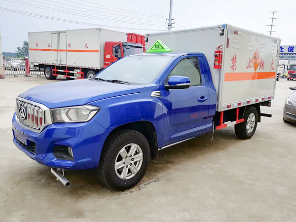 廂體全金屬整體骨架結(jié)構(gòu),外飾冷軋鋼板(隔熱,防靜電),內(nèi)飾鋁板(隔熱,防靜電),中間骨架結(jié)構(gòu)(提高廂體強(qiáng)度),所有箱板內(nèi)部填筑阻燃高強(qiáng)度泡沫板整體高壓粘合鉚接后焊接拼裝成廂型,底板鐵板上鋪設(shè)防靜電膠皮(絕緣,導(dǎo)靜電),前臉底部鋁板上加裝靜電防撞膠皮,內(nèi)飾臥環(huán)(固定貨物定位拉環(huán)),透氣孔,外部帶通風(fēng)孔,保持廂體與外部空氣流通,及時(shí)與外部空氣交換,確保安全,大梁加裝拖地靜電膠帶,把貨物摩擦靜電導(dǎo)入大地。車輛門框配備防盜報(bào)警器,廂內(nèi)頂部安裝煙霧報(bào)警器,前廂板左右立柱安放滅火器,排氣管前置安裝排氣火花熄滅器,駕駛室安裝“危險(xiǎn)品”標(biāo)志燈,車廂外中部粘貼橙色反光帶一周,并在車廂左、右、后安裝“爆炸品”菱形牌3塊,車體后部設(shè)置安全告示牌、“危險(xiǎn)品”黃色警示牌,后保險(xiǎn)杠安裝緩沖加強(qiáng)橡膠塊等。車廂開側(cè)門,方便裝卸貨物;可加開隔倉,方便不同性質(zhì)的爆破物品同車分倉運(yùn)輸。