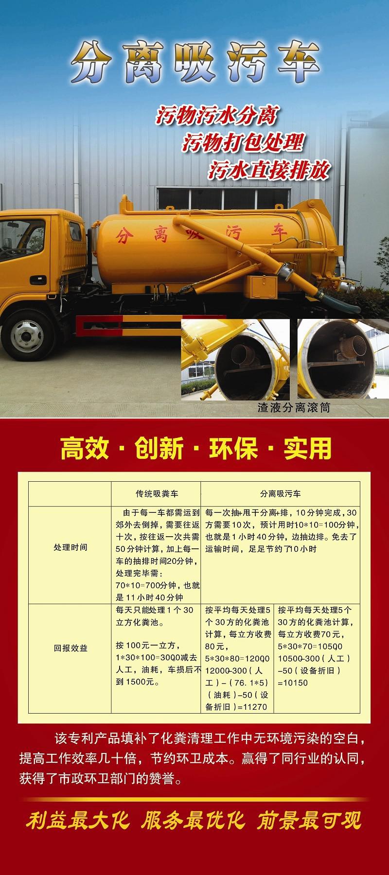 分離式吸污車采用國內(nèi)技術(shù)領(lǐng)先的吸污專用泵,吸力大,吸程遠(yuǎn),特別適合用于下水道內(nèi)的淤積物的抽吸、裝運(yùn)和排卸,尤 其是可吸下水道泥漿、淤泥、石子、磚塊等較大物體、含水量較小等物質(zhì)。抽滿污(糞)罐體時間:≤5min,吸程:≥10m。自吸自排,壽命長,工作速度快 ,運(yùn)輸方便。