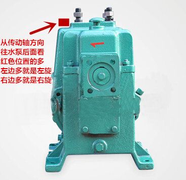 2、如果看不到灑水泵標(biāo)牌,那么就按照張部長(zhǎng)教的方法,從水泵傳動(dòng)軸方向往后看,看看水泵上不進(jìn)水口位置兩次多出來的空間,哪邊多,就是什么旋轉(zhuǎn)的,如下圖,左邊的空間多,那么就是左旋的。國(guó)內(nèi)的灑水車水泵廠家,都可以這樣區(qū)分。
